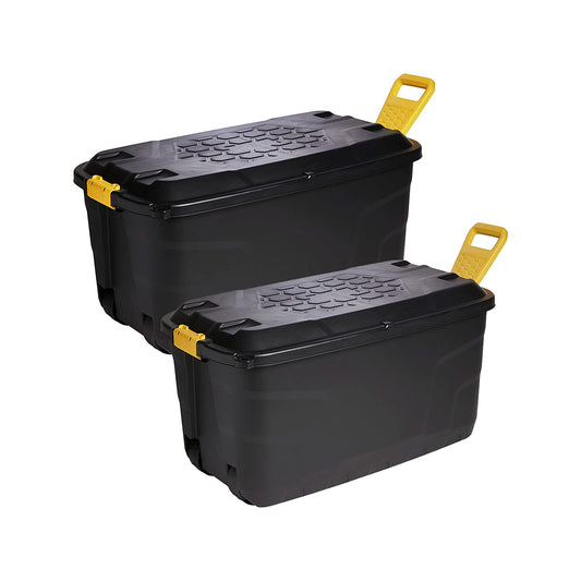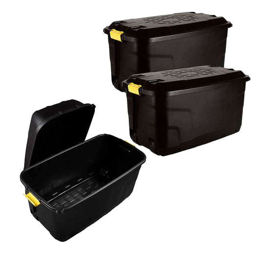 Large Heavy Duty Indoor Outdoor Black Storage Trunks With Lids, Wheels & Yellow Handles