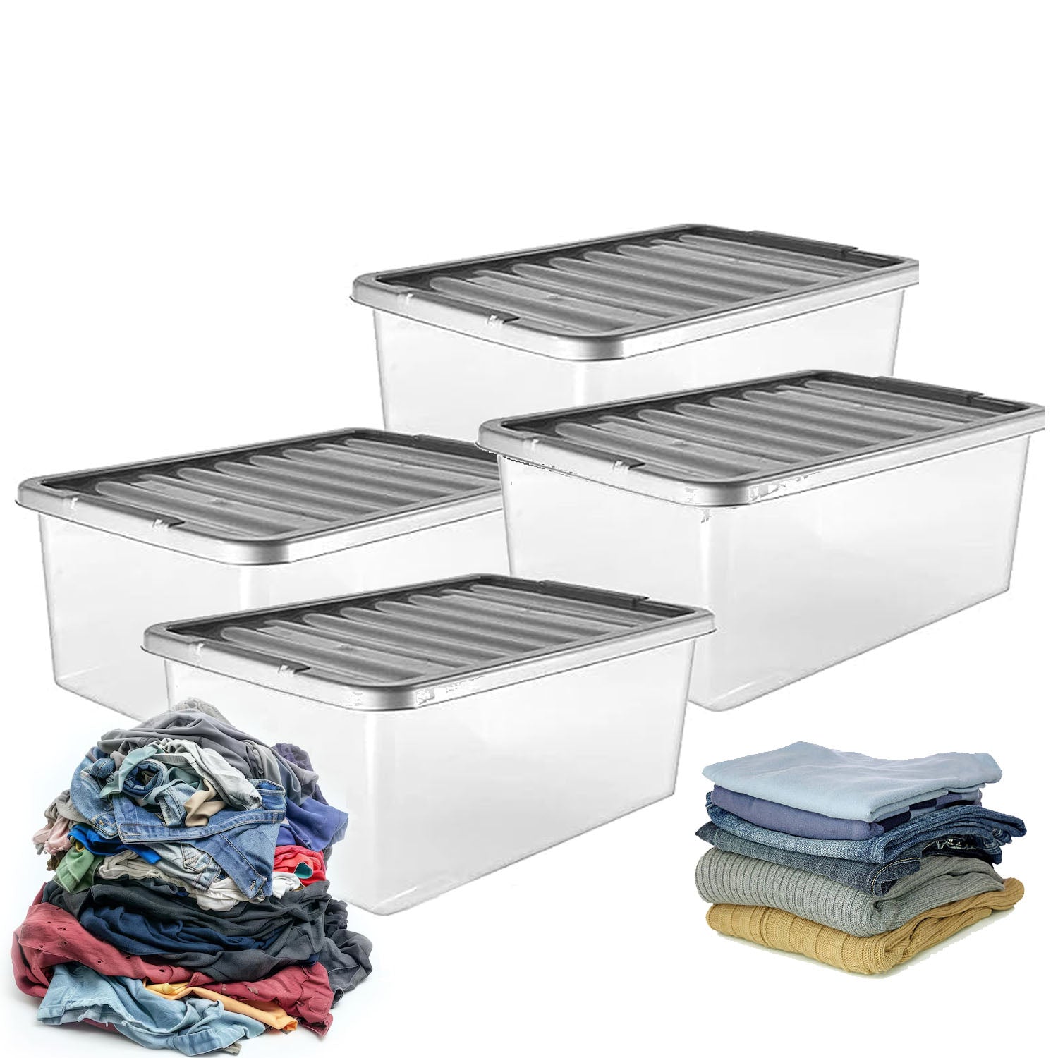 These 32-litre plastic storage containers are designed for versatile home and office use. Ideal for under-bed storage, they efficiently organize paperwork, cleaning supplies, tools, and more. Each set includes four durable containers with secure silver lids, providing a practical solution to keep your living room, bedroom, or garage tidy and clutter-free.