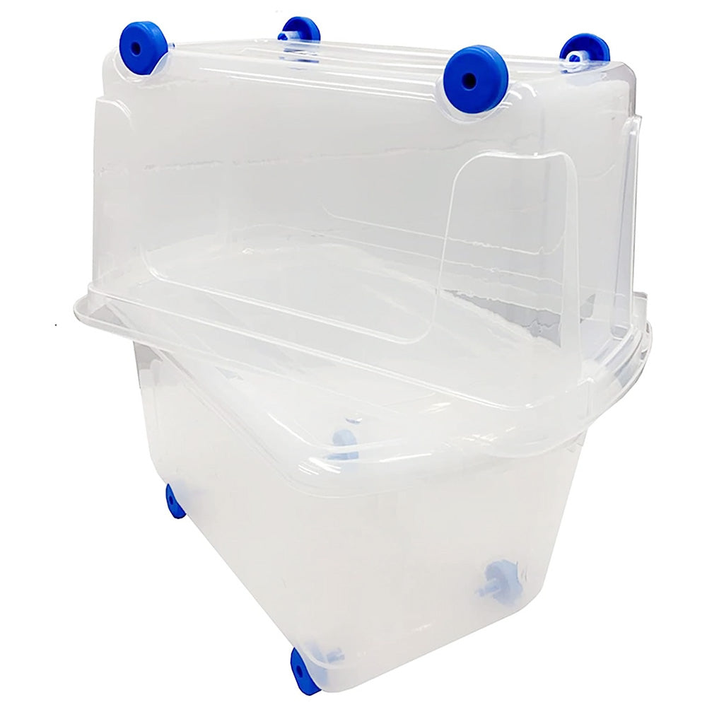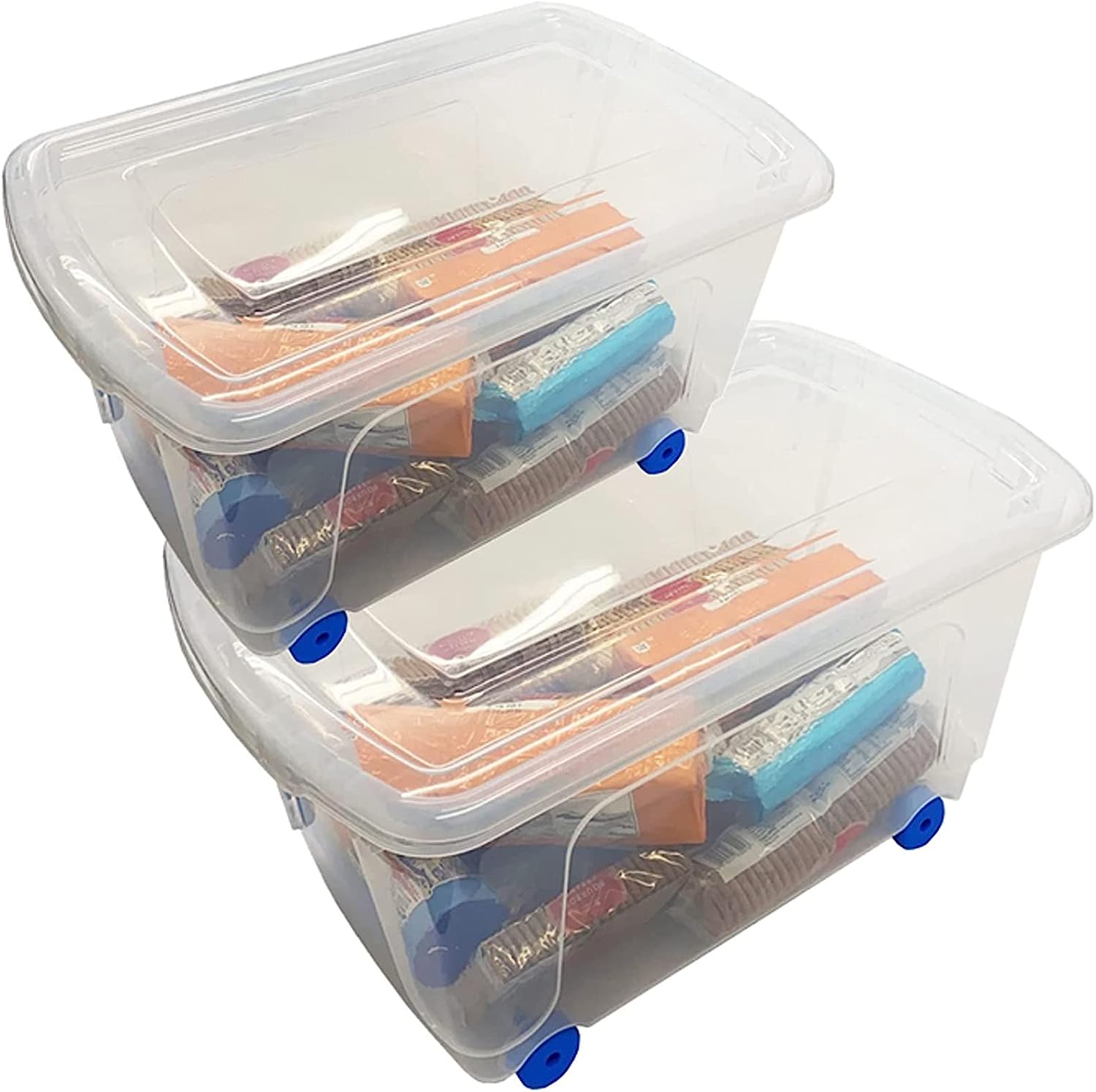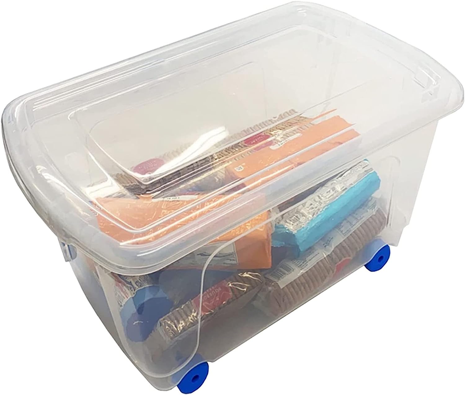 Clear storage boxes are a ideal way to store and organise a range of items from clothing, toys to books etc. The boxes come complete with a lid and wheels (4 wheels on each box). Featuring a reinforced base these boxes are impact resistant making sure items are kept secure at all times. The wheels on the box make it easy to move and store. The boxes are transparent which makes it easier to view contents without having to open the box.